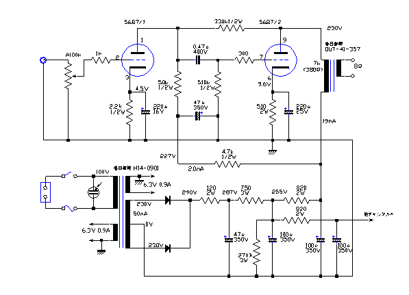 5687(5687WB)について 2号機の5687パラシングルを作ったとき、かなり素直な音だったのでこの球はもっとつかえるなって思っていました。7.5Wの入力で2Wの出力というのはプレート効率が非常にいい。2本合計のプレート損失が7.5Wだからパラシングルはもちろん1本でPPなんてできる。シングルでもパラで2Wとれるから1ユニットではプレート損失4.25Wまでいいので1.3Wくらい取れるかな? とにかくこの小さな球には可能性いっぱいでした。ただほんとうに玉にキズなのが・・・ヒーターのおお食らい!0.9Aも! このヒーターと小さめのバルブにしては大きなプレート損失のために発熱量が大きいこと。まあそれだけパワーがあるわけ! 片ユニットをドライバーにする場合μが18なのでGainがきびしいこと、あとgmが大きいので発振対策が必要です。 |