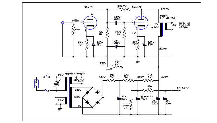 6CS7シングルアンプの回路 ラジオ技術社の「全日本真空管マニュアル」にオーディオアンプの動作例が載っていたことから、いつか6CS7で3極管シングルアンプを作ろうと思ってストックしていた。ただドライブ側のユニットが中μなので段のGAINがきついなあとおもい実現してなかった。なつかしい神戸TENの青箱入りが6本、GEが2本。もちろん今回はTENを使用。やはり日本製のほうが特性のばらつきが少ない。(もっともLowμ、Hi-Gmの球は構造がシビアだから仕方ない?)結局できたアンプは球がなかったら石のアンプくらいのサイズにもかかわらずけっこうピシッとした音がする。miniパワーなのにけっこう元気のいい音がする。う〜ん、もっと6CS7を布教したいなあ。 結局GAINにすこし余裕ができたので他のアンプと同じ0.7Vにあわせるくらい、軽くPG帰還をかけてみた。 |