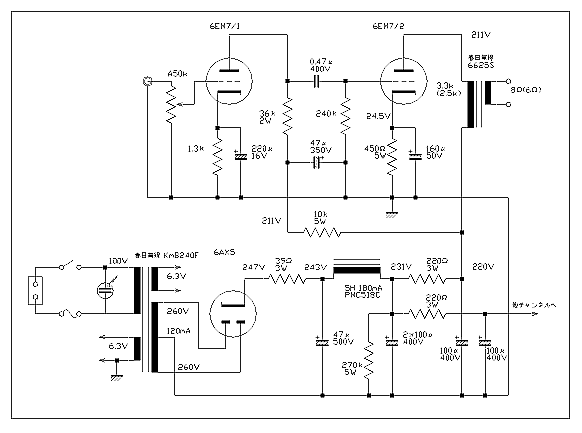 6EM7は内部抵抗が2A3と同じくらい低いので電源回路は十分に大きい平滑コンデンサーを使用してハムの防止とアイソレーションを確保するようにした。 電源は整流管による両波整流で5Y3でもよかったのだが市場で結構高価なことと、GT管としては小柄な6EM7に高さをそろえるために6AX5を採用した。電源トランスのヒータータップは5Vも取れるので5Y3等にも変更できる。